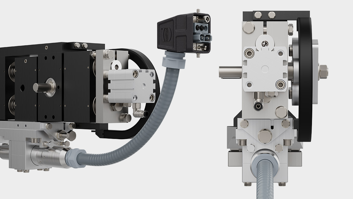トップシール・モジュールには空圧発生装置が組み込まれており、自由度の高いドライブコンセプトを提供しています。空圧ドライブと電動ドライブを駆動軸に取り付けることができます。パッキング装置の主駆動軸と機械的に結合することも可能です。さまざまなアッセンブリコンディションを満たすため、モジュールの左右どちらかにドライブを据付けられます。これはマルチラインシステムの場合に特に便利です。